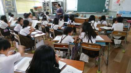 写真は、担任の先生から、通学路の変更について聞いている様子です。