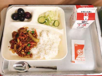 【大豆入りキーマカレー[米粉]、グリーンサラダ[ノンエッグドレッシング]、ぶどう(巨峰)、牛乳】