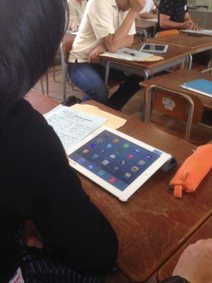 7月2日(水)に行われた、本田小学校のICT活用公開授業研究会に参加してきました。本田小学校もICTのモデル校なので、タブレットが先行導入されています。ここはiPadが導入されていました。いろいろなアプリがあり、公開授業の後、実際に体験させていただきました。
