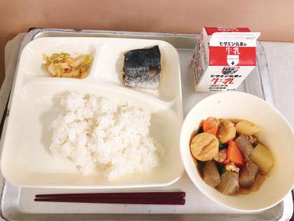 【さごしの塩焼き、じゃがいもと一口がんもの煮もの、キャベツのおひたし、ごはん、牛乳】