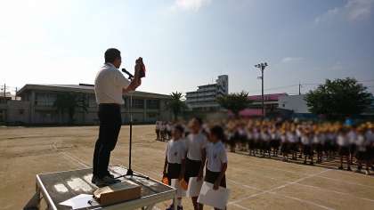今日は、爽やかな天気でしたので、久々に運動場に出て児童朝会を行いました。