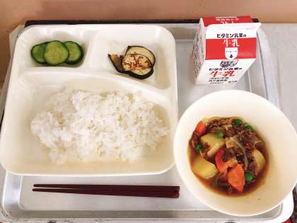 【肉じゃが、焼きなすのみそだれかけ、あっさりきゅうり、ごはん、牛乳】