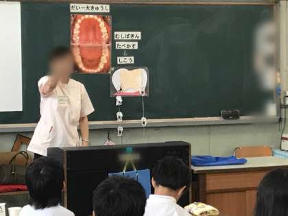 学校歯科医の先生、歯科衛生士さんに来ていただいて、歯の大切さと歯の磨き方の学習をしました。