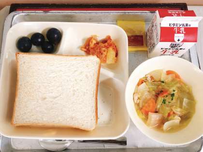 【鶏肉とてぼ豆のスープ煮、じゃがいもとトマトのチーズ焼き、ぶどう(巨峰)、食パン、りんごジャム、牛乳】