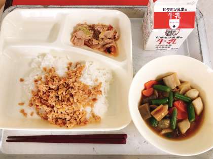 【豚肉のねぎじょうゆ焼、ふきよせ煮、ツナ大豆そぼろ、ごはん、牛乳】