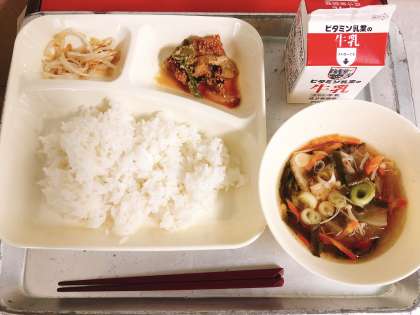 【鶏肉のごまだれ焼き、ソーキ汁、もやしのしょうがじょうゆあえ、ごはん、牛乳】
