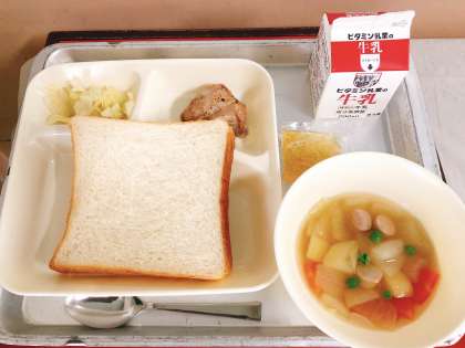 【鶏肉の香草焼き、スープ煮、サワーキャベツ、食パン、マーマレード、牛乳】