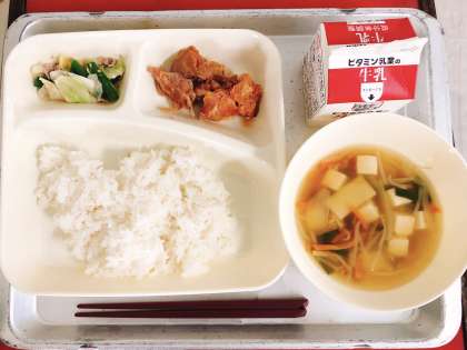 【鶏肉のチリソース焼き、とうふとワンタンの皮のスープ、中華いため、ごはん、牛乳】