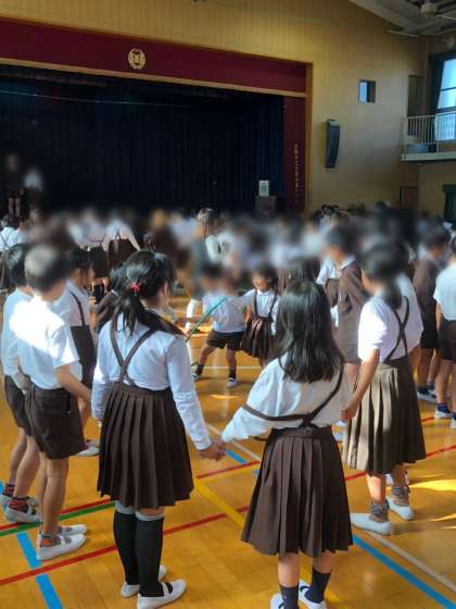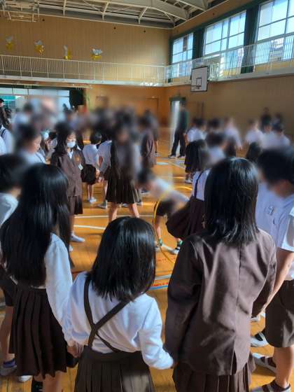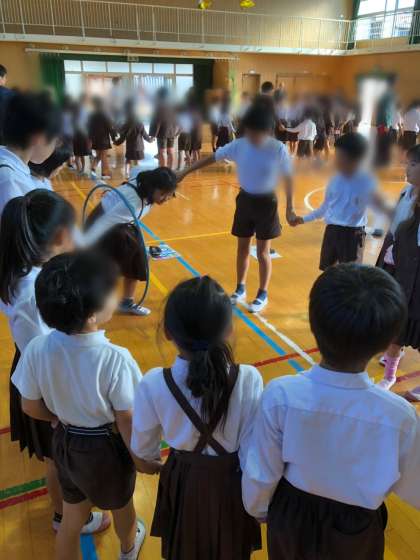 今日の児童集会は、縦割り班で、輪くぐりゲーム(フープくぐりゲーム)を行いました。