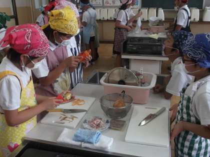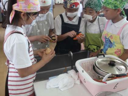 7月16日(水) 林間の飯盒炊飯の予行練習として、カレーを作りました。きちんと指示通りに協力し、てきぱきできています。