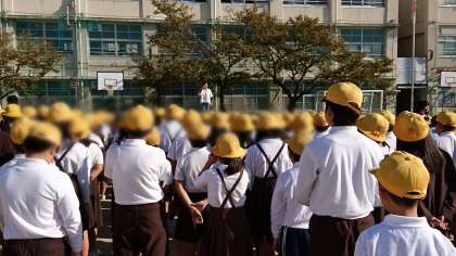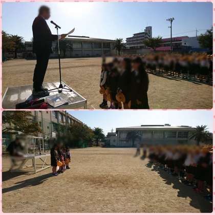 写真は、表彰の様子と、いつものように校歌を歌っている様子です。