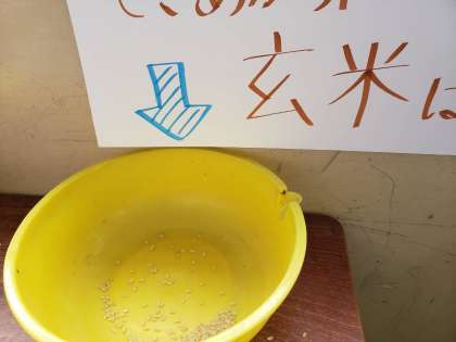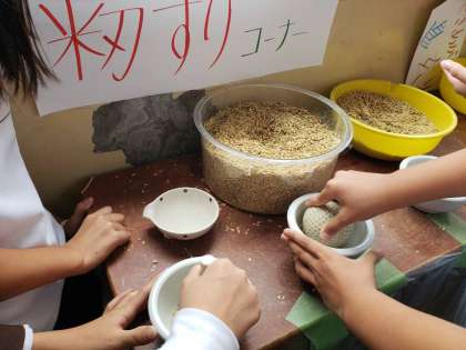 脱穀した稲の実の籾すりをして玄米にしていきます。口に入るお米ができるまでの苦労を味わっています。