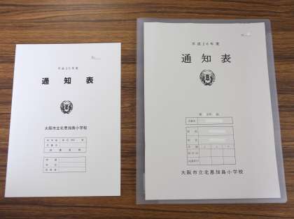 写真右 今年度からの通知表 サイズも大きくなりました。