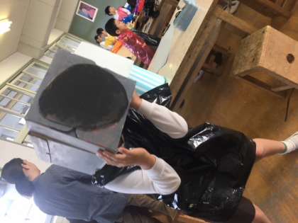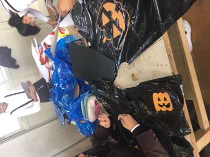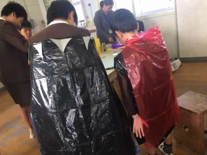 図工でハロウィンのコスチューム作りをしました。カラーのビニール袋をベースに、学校にあるもので上手に装飾しています。