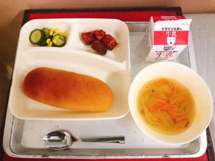 【まぐろのオーロラ煮、スープ、きゅうりとコーンのゆずドレッシング、黒糖パン、牛乳】