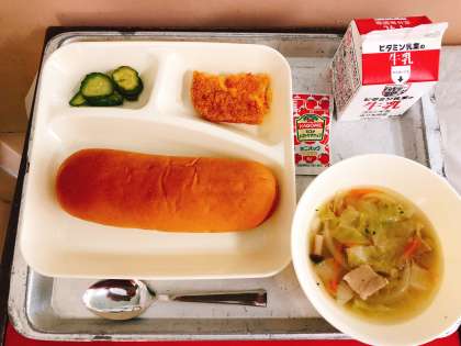 【ツナポテトオムレツ、スープ、きゅうりのバジル風味サラダ、黒糖パン、牛乳】