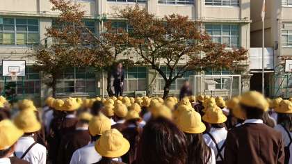 児童集会での校長先生の話は、先日の修学旅行で6年生ときまりの約束をした話「あなた」の言葉についてです。
