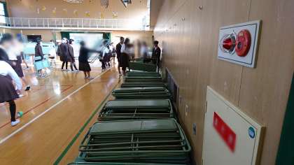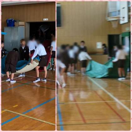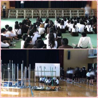 講堂全体を使えるように、体育の用具を倉庫へ運んだり、楽器を音楽室から運んだり…全員で協力して行いました。