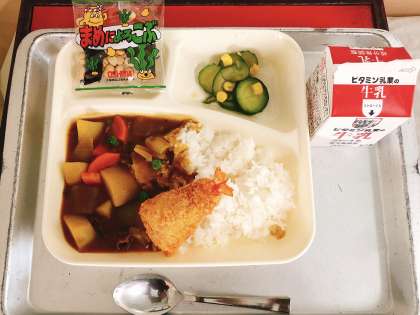 【えびフライカレーライス、きゅうりとコーンのサラダ、豆こんぶ、牛乳】