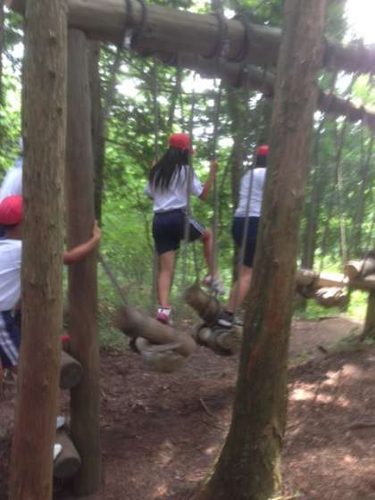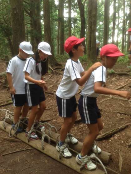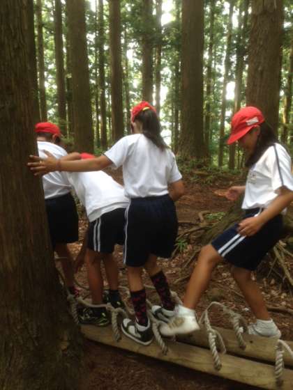 昼食後はフィールドアスレチックに挑戦します。いろんな運動を体験しますが、森の中でのムカデ歩きにみんな大苦戦!ここでもチームワークが試されます。心を合わせて、1・2・1・2!