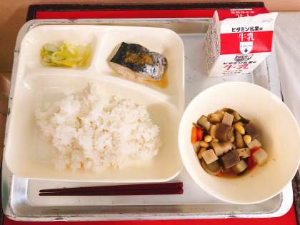 【さごしのおろしじょうゆかけ、五目豆、はくさいの甘酢あえ、ごはん、牛乳】