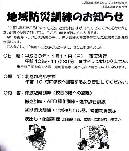 明日(11月11日)、北恩加島地域防災訓練が行われます。
