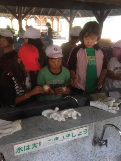 焼きそば作りの下ごしらえで、玉ねぎの皮をむいています。その後、包丁で野菜を切っています。火おこしの役割、下ごしらえの役割、一人一人が協力して作業を進めます。
