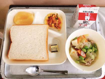 【豚肉と野菜のスープ煮、変わりピザ、白桃(缶)、食パン、バター、牛乳】