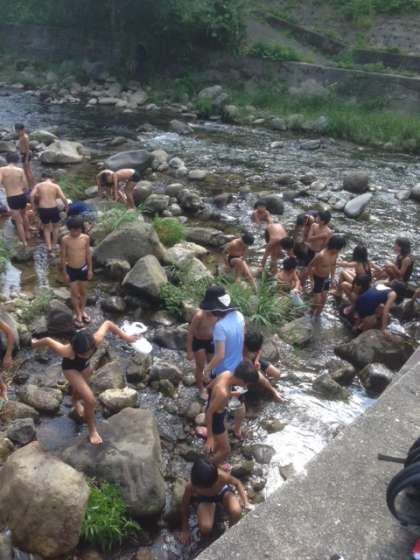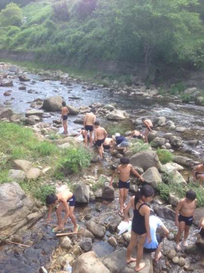 川遊びが始まりました。大きな岩や石がごろごろ転がっているので、足元に気をつけなければいけません。でも石をめくると、いろんな生き物がいるようです。魚はいるかな?サワガニはいるかな?