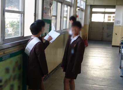 代表委員の子どもたちが中心になって休み時間に、廊下を歩いて通ることを呼びかけています。