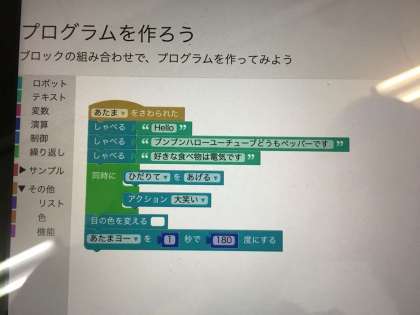 タブレット端末を使って、ペッパーくんを動かす体験しました。
