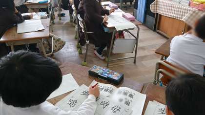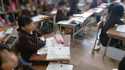 先生が書く書き順と自分の書き順が合っているか、見比べています。