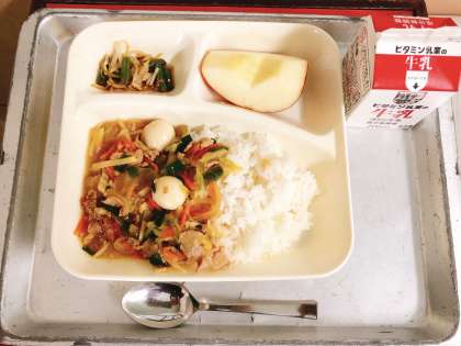 【中華丼、もやしの中華あえ、りんご、牛乳】