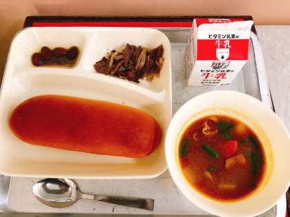 【牛肉の香味焼き、豚肉とだいこんのカレー煮、うずら豆のグラッセ、黒糖パン、牛乳】