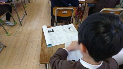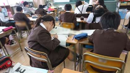 前年度までの経年調査のプリントを使って、自分で解答したあと、先生に説明してもらいながら、答えを確認しています。