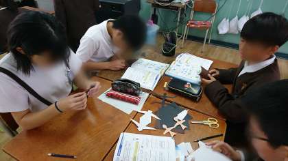 色紙を使って、折り、形を決めて、切っています。