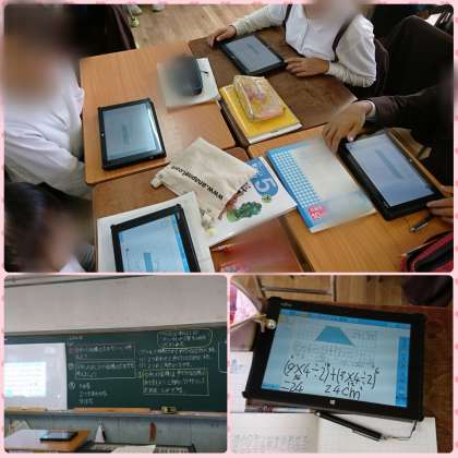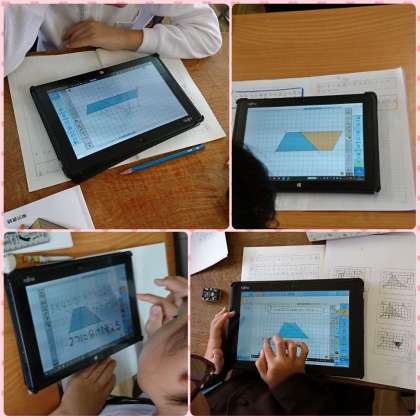 タブレット端末を使って、今までに習った図形に形を変えて、求め方を考えていました。