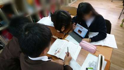 教科書で学習した「和の文化を受けつぐ」から、グループでテーマを決め、テーマの歴史や他の文化との関わりなど分担して調べています。