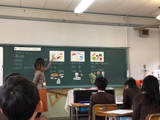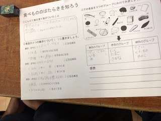 栄養教諭の先生に、黄赤緑の食べ物の働きについて教えていただきました。