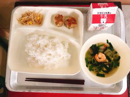 【あげシューマイ、えびととうふのスープ、もやしとコーンのピリ辛あえ、ごはん、牛乳】