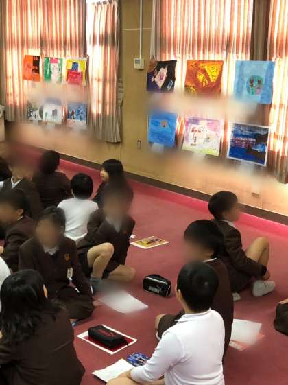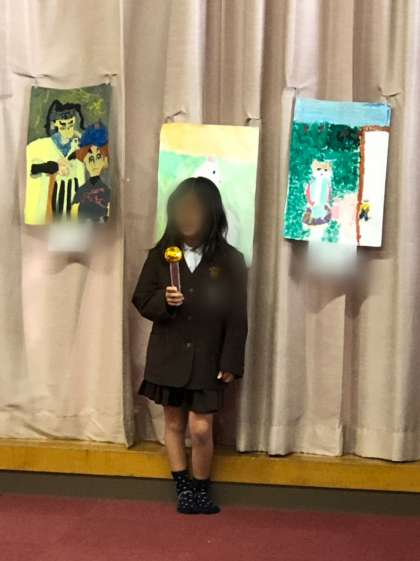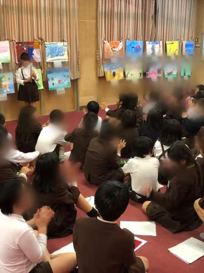 鑑賞会で、自分の絵の紹介をしたり、説明を聞いたりしているところです。