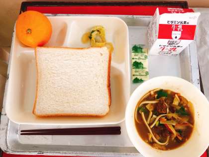【カレーうどん、はくさいのおひたし、みかん、食パン、マーガリン、牛乳】