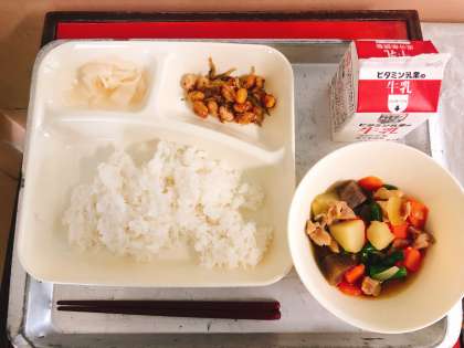 【鶏肉と野菜の煮もの、じゃこ豆、かぶのゆず風味、ごはん、牛乳】
