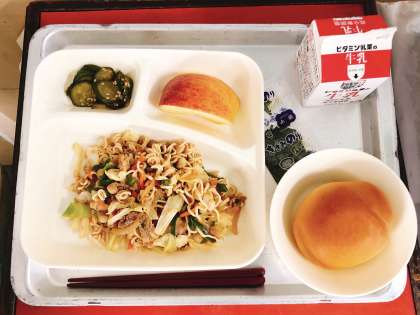 【オイスターソース焼きそば、きゅうりの中華あえ、りんご、黒糖パン1/2、牛乳】