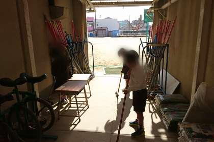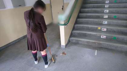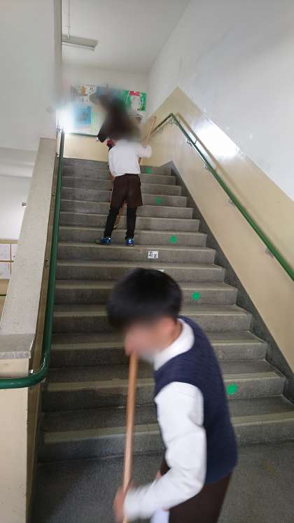 隅々まで丁寧にはいて、ごみを集めています。1年生は、物を動かして、掃除をしています。