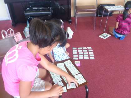 エアコンが設置されている部屋では、それぞれの学年が学習会を行っています。夏休みの宿題を中心に1学期の内容を復習しています。お家でだらだらしてしまいがちになりそうでも、友だちと一緒に取り組むとはかどるのか、どんどん課題をこなしています。また3年生は、あまった時間に五色百人一首(二十首ごとに色分けされ、覚えやすい札の百人一首)にも挑戦していました。
