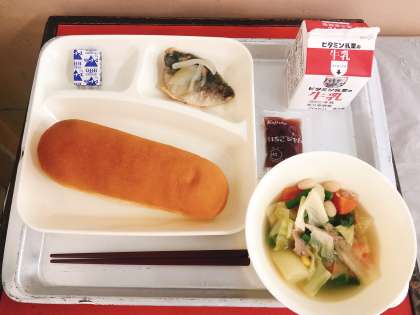 【あじのレモンマリネ、スープ煮、固形チーズ、コッペパン、いちごジャム、牛乳】