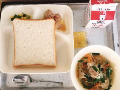 【鶏肉のオイスターソース焼き、糸寒天のスープ、チンゲンサイとコーンの中華あえ、食パン、マーマレード、牛乳】