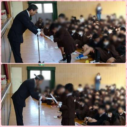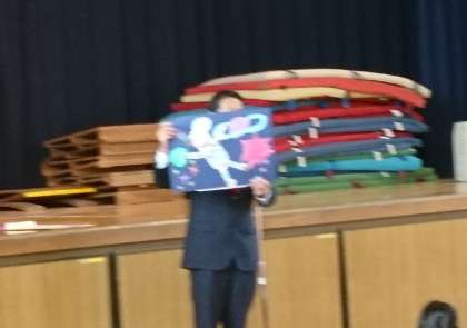 図画工作展で表彰された2名の作品を紹介し、校長先生から賞状をわたされました。