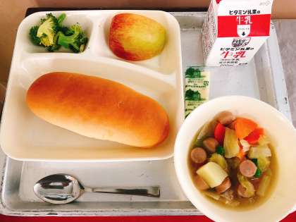 【鶏肉と野菜の洋風煮、ブロッコリーのサラダ、りんご、コッペパン、マーガリン、牛乳】